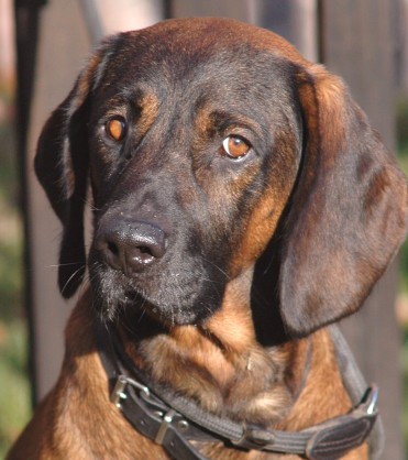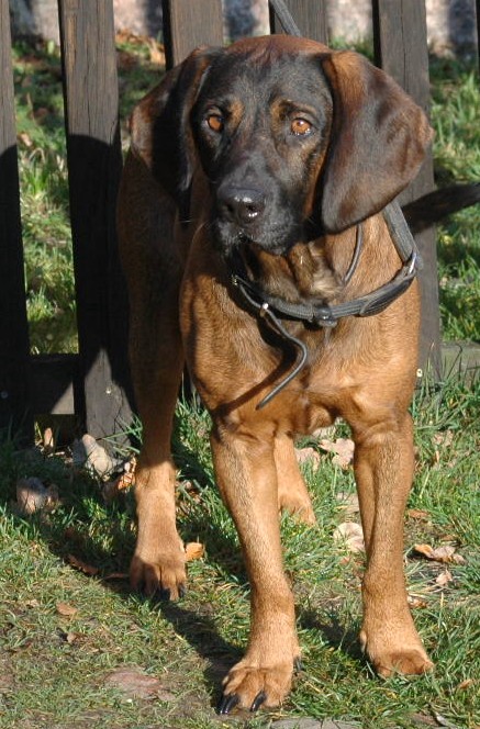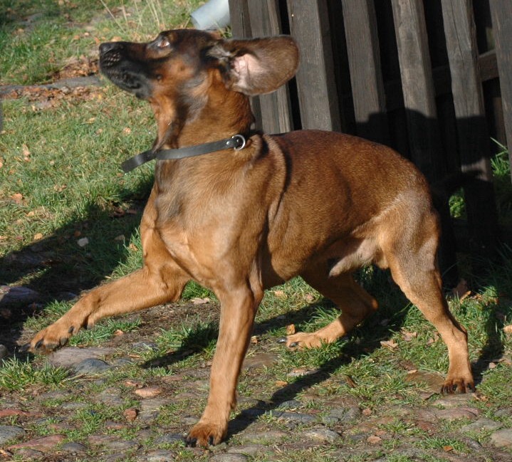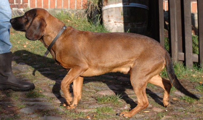 Spürt ein gut und souverän geführter Hund Unsicherheiten, wird er völlig normal aus Sicht des Hundes die Defizite seines Halters auszubügeln versuchen. Und diese Versuche ordnet ein unerfahrener Halter dann oft als Dominanz, als Ungehorsam ein und ist verwirrt, da der Hund doch als so hervorragend beschrieben wurde..... Um den Vergleich plastischer zu machen: Ein Ferrari ist in der Hand eines Könners ein berauschendes Auto, ein Anfänger wird ohne Zweifel schnell am Baum landen. Aber in unserem Fall ist die Rede von HANNO. Hanno ist ein wunderbarer, in Niedersachsen geborener Hannoverscher Schweisshund, der gerade einmal 7 Jahre jung wurde und damit im besten Alter ist. Er ist nicht jagdlich geführt worden, was aber nichts daran ändert, dass Hanno natürlich das Erbe seiner Vorfahren in sich trägt und gerne die Welt per gesenkter Nase erforscht. In dichten Waldgebieten wurde Hanno an der Leine geführt, im Waldumfeld oder auf Wiesen lief er frei und liess sich gut abrufen. Der grosse Vorteil von Hanno ist, dass er kein Kostverächter ist – eine Tatsache, die wir uns per gefülltem Leckerli-Beutel natürlich zu Nutzen machen können..... Hanno hatte bisher ein ländliches Umfeld mit viel Platz und frischer Luft, natürlich lebte der kurzhaarige Hund mit im Haus und wird auch ausschliesslich in Haushaltung vermittelt. Hanno wird lediglich abgegeben, da eine seiner Bezugspersonen ein schwerer Pflegefall wurde und eine Versorgung des Hundes leider zeitlich nicht mehr möglich ist. Hanno ist – wie geschrieben – am 1.Oktober 99 geboren, hat Welpenspielkurse besucht und ist der letzte Hund seines Halters in einer langen Reihe von Vorgängern. Hanno ist ein regelmässig entwurmter und geimpfter Familienhund gewesen, der – ich muss es noch einmal erwähnen – hervorragend erzogen ist. Ich habe ihn vor langer Zeit einmal im Wartezimmer meines Tierarztes getroffen und war damals schon begeistert, wie ruhig und gelassen er jeden Umweltreiz aufnahm, wie ausgeglichen er seinen Besitzer begleitete. Hanno kennt Kinder und hat keine Probleme mit ihnen. Da er aber selber in einem kinderlosen Haushalt lebte, wird er ggf. nur in eine Familie mit grösseren Kindern vermittelt. Jogger sind für ihn Luft. Jogger – was ist das? (O-Ton Hanno)