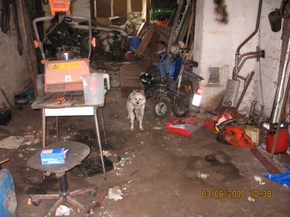 Den meisten Leuten mangelt es an Phantasie, sich vorzustellen, was Kreisveterinäre antreffen, bevor sie Tiere konfiszieren. Ich habe im Büro unserer Kreisveterinärin auf einer Pinnwand eine Bild-Auswahl von Tieren in Not betrachtet, die wieder einmal meine Hoffnung auf ein besseres Umfeld für Tiere ersterben liess. Auch TARZAN (er hatte diesen Namen bereits!) kommt aus einer Beschlagnahmung und es macht mich glücklich, zu sehen, wie der kleine Hundemann aufgeblüht ist Dank Zuspruch, gutem Futter, Licht und Bewegung. Hier zur Einstimmung seine bisherige Bleibe: Dazu müssen Sie sich allerdings die Doppeltür, die jetzt zum Fotografieren offen steht, geschlossen vorstellen! Dieser arme Hund hat eine viel zu lange Zeit in diesem Dreckloch gehaust und ist durch die Anzeige einer engagierten Tierfreundin von der Kreisveterinärin samt Hündin Jette (die in der Nebengarage hauste) befreit worden. Wie alle Hunde von schweren Alkoholikern waren beide Hunde anfänglich ein Bündel aus Angst und Panik, was durch Knurren übertönt werden sollte.
