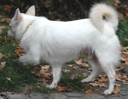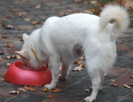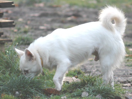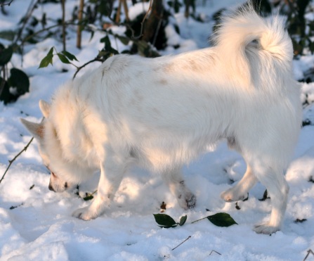 Als sie aber in der letzten Woche plötzlich mitten im Gelände rief: ICH HAB`S! KARLSSON! …. Da hörte ich auf, mit Bärchen zu balgen und kam gleich zu ihr gelaufen. Und seit dem Tage heisse ich nun KARLSSON (vom Hundehaus – nicht vom Dach!) und Tarzan ist Schnee von gestern und nicht mehr mein Name!! Schön, nicht? Und damit ihr mich auch mit aktuellen Fotos einordnen könnt, ein paar für meine Anhänger…… Erstens habe ich jetzt Wintertüpfel in schönem Karamell und zweitens eine etwas sehr wohlgeformte Taille. Aber ich musste den Welpen einfach vormachen, wie mit Appetit gefressen wird!!!
