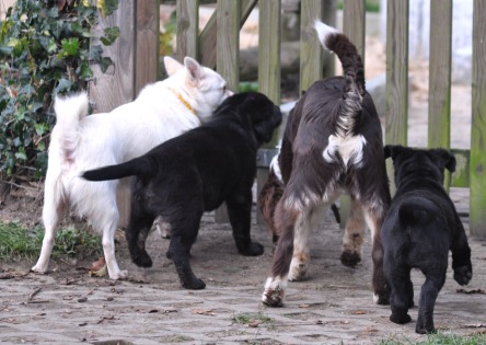 Die beiden Knuddel wurden entwurmt, eine Woche später geimpft und gechippt. Der Kontakt zu den anderen Welpen, zu Tarzan, Zack und Hansen – alles kein Problem für die beiden Zwerge. Diese Hunde sind so etwas von „street smart“, von lebenstüchtig, dass es unglaublich ist. Sie sind am 30.9. geboren, also heute, am 9.12., noch nicht einmal 10 Wochen jung, aber durch nichts und niemanden einzuschüchtern oder gar von ihren Vorhaben abzubringen.