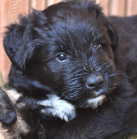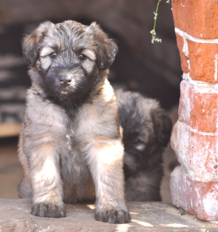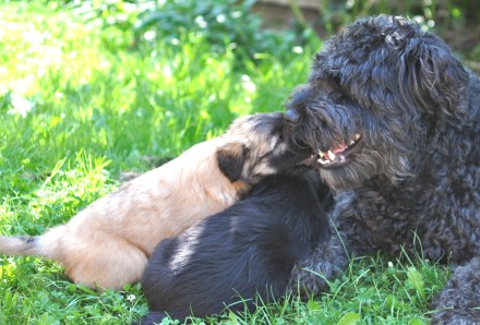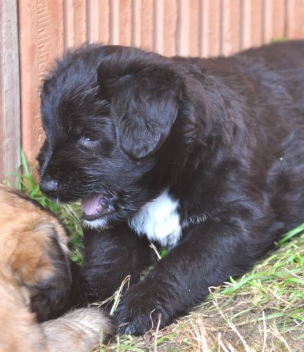 Die Hundshuus-Stammleser wissen, wie ich zu Hundevermehrung und Welpen stehe…. Das ändert aber nichts daran, dass von Zeit zu Zeit bereits geborene Tiere entsprechende neue geeignete Plätze suchen und deshalb finden Sie wieder einmal einen kompletten Wurf auf dieser website. Die hier gezeigten Hundekinder sind eine Kreuzung aus zwei rassereinen Elterntieren, die jedoch in puncto Einsatzgebiet im Grunde genommen einer Familie angehören: Die Mutter ist eine reinrassige Bouvier des Flandres-Hündin, der Vater ein reinrassiger Deutscher Schafpudel.