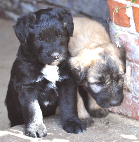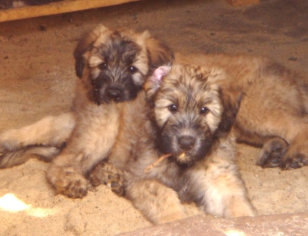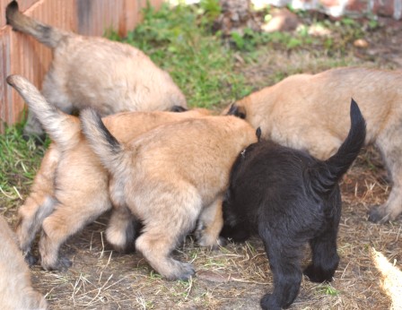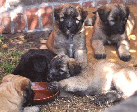 Die Welpen (6,2) sind am 29.Juni 09 geboren. Es handelt sich um 2 schwarze Rüden, 4 fauve-farbene Rüden und 2 Hündinnen in fauve (weizen- bis goldblond). Zum 1.September werden die Zwerge in ihr neues Zuhause umziehen können. Bis dahin sind sie regelmässig alle 14 Tage entwurmt worden, haben den ersten Teil der Grundimmunisierung erhalten, sind gechipt und registriert und werden mit viel Elan den Dingen, die da kommen werden, entgegen sehen. Wenn Sie an einem dieser Wonnenproppen Interesse haben, möchte ich Sie bitten, die übliche schriftliche Bewerbung an mich zu senden, in der Sie mir bitte Ihre häuslichen Umstände schildern und auch erwähnen sollten, weshalb Sie einem der Welpen dieser Rassen ein Zuhause bieten möchten.